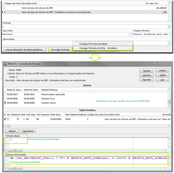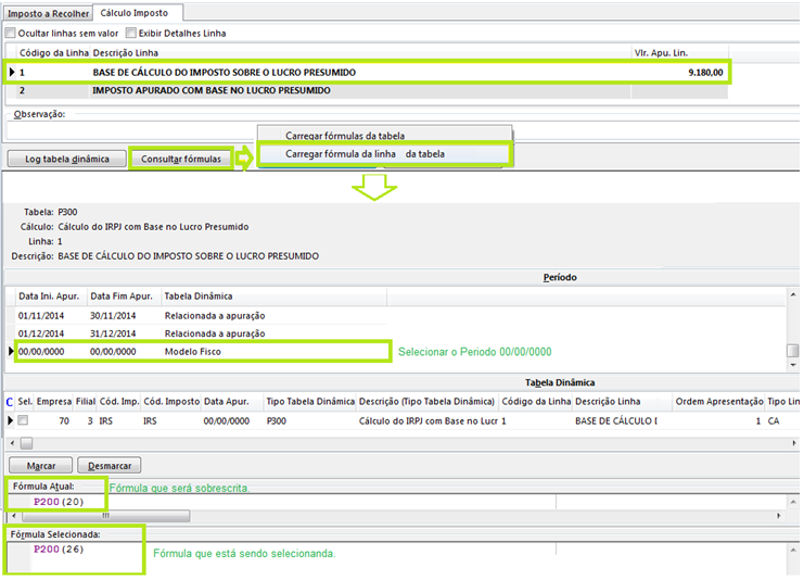 Para recuperar uma fórmula padrão para uma determinada linha deve ser utilizado o recurso Consultar Fórmulas > Carregar fórmula da linha XX da tabela XXX.
