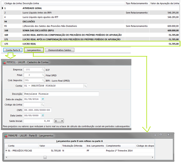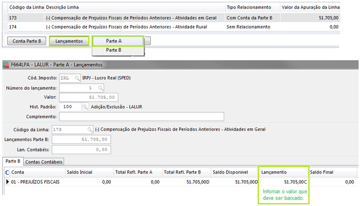 Se houver compensação de prejuízos fiscais em períodos posteriores, deve ser utilizada essa conta criada na parte B para compensação no registro M300 (Linhas de código 173 e 174 do M300), com tipo de relacionamento “1” (com conta da parte B).