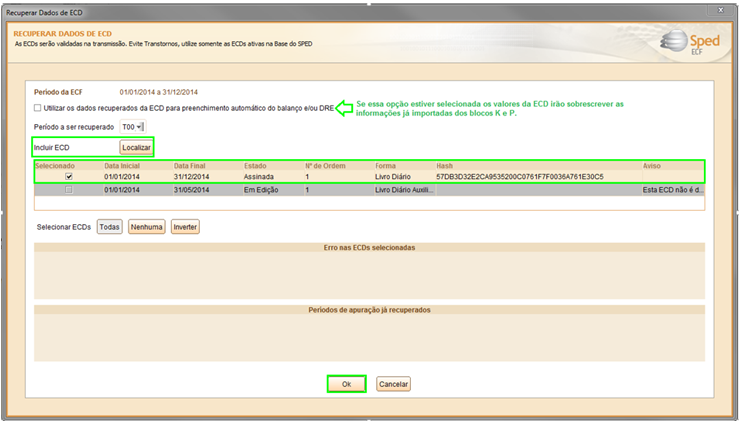 O programa da ECF consegue recuperar mais de um arquivo da ECD, desde que os períodos dos arquivos da ECD sejam equivalentes ao período do arquivo da ECF.
