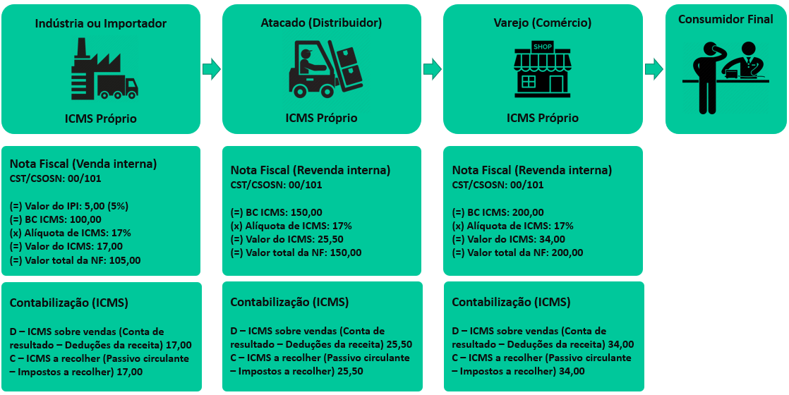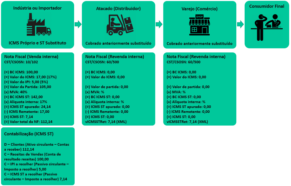 Por exemplo, quando efetuamos uma venda de mercadoria sujeita ao regime de substituição tributária de uma indústria ao distribuidor, o industrial deverá presumir e recolher o ICMS que será gerado nas operações subsequentes com esta mercadoria, ou seja, deverá ser retido no início da cadeia o ICMS, que será devido na venda do distribuidor para o varejista, e na venda do varejista para o consumidor final.