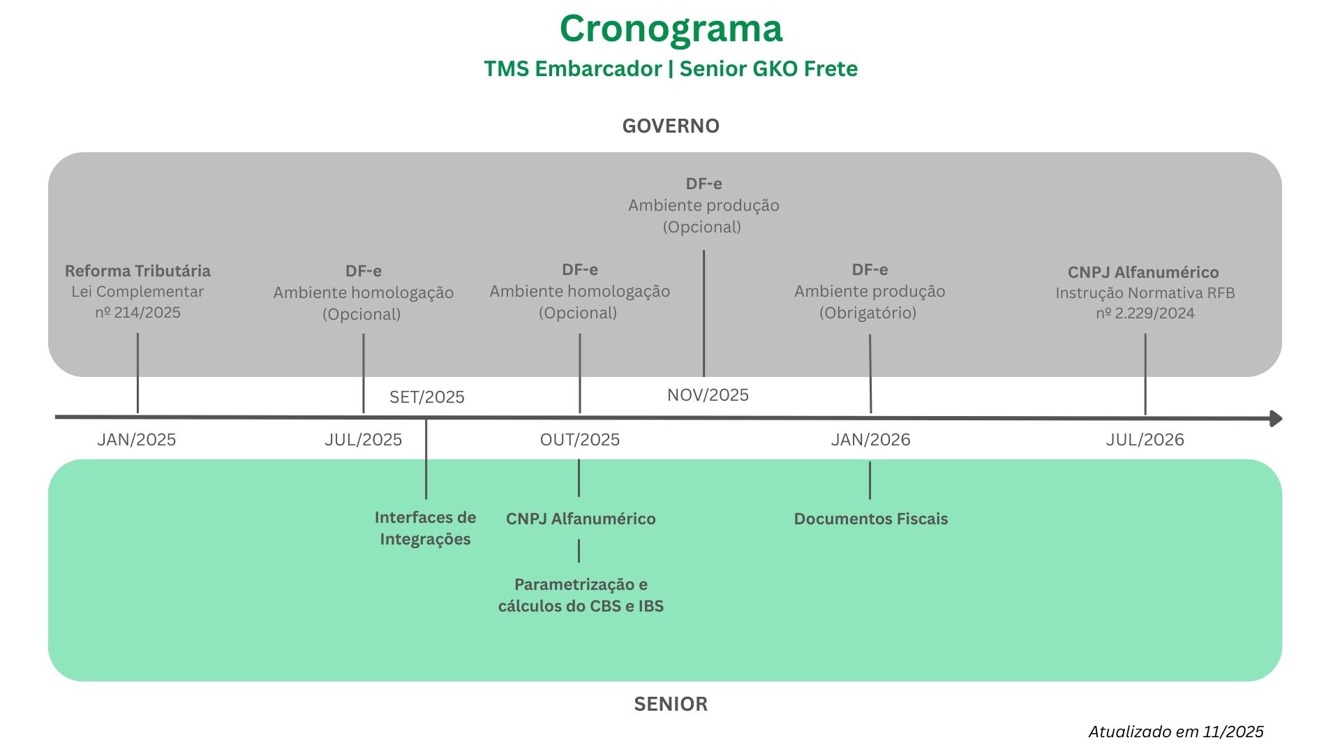 Para garantir a conformidade com a nova legislação, o TMS Embarcador | Senior GKO Frete passará por ajustes em layouts de telas, cadastros, parâmetros e integrações.
