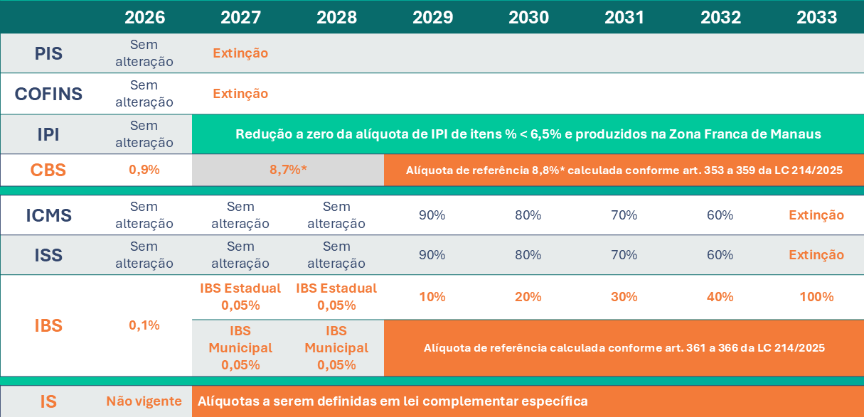 Este ano servirá como um período de testes para a CBS (Contribuição sobre Bens e Serviços) e o IBS (Imposto sobre Bens e Serviços). O valor arrecadado da CBS (0,9%) e do IBS (0,1%) será usado para compensar os valores devidos de PIS e COFINS.