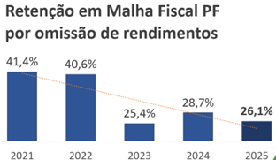 O apoio da Receita acaba se refletindo em maior grau de conformidade, algo positivo para o cidadão e para o Fisco. Com o número crescente de utilização da pré-preenchida, constatou-se uma redução significativa na retenção em malha em função de omissão de rendimento, conforme dados a seguir.