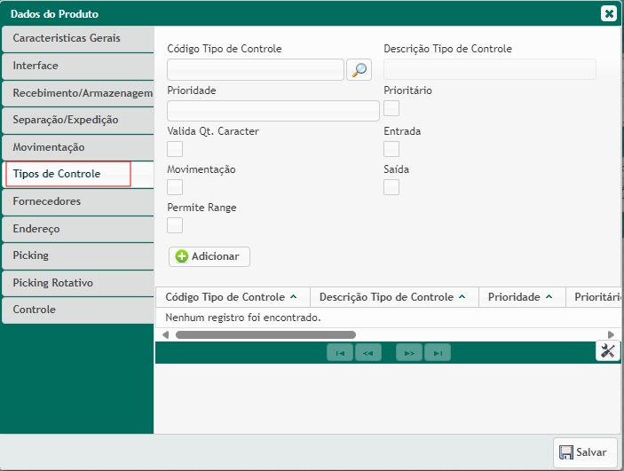 - Código do Tipo de Controle: Certifique-se de que o tipo de controle esteja previamente cadastrado. Se não estiver, faça o cadastro em Cadastro de Tipo de Controle. Nessa tela, você pode simplesmente selecionar o tipo de controle desejado para vinculá-lo ao produto.