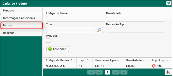 - Imp.Etiqueta: define qual o código de barras deverá ser impresso na etiqueta de produto. Essa informação é para os casos em que o produto tenha mais de um código de barras cadastrado.