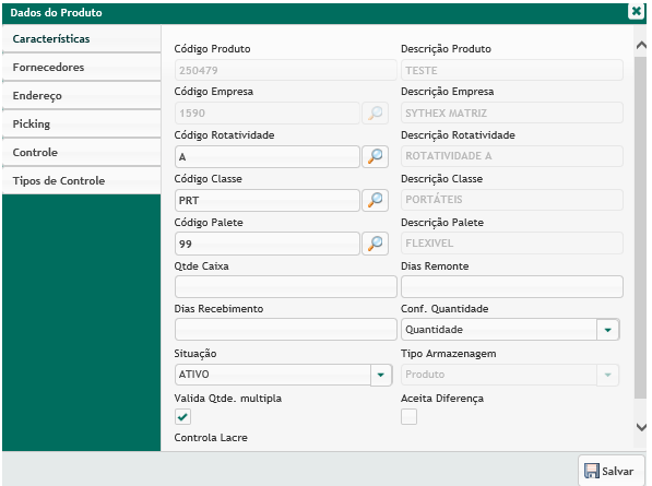 - Endereço: informar qual será o endereço de Picking do produto; o conceito de endereço de Picking são aqueles normalmente de nível baixo, onde o usuário consegue fazer a separação sem auxílio de equipamento. Esse endereço de Picking ao ser criado, precisa estar vinculado a uma área compatível, para que o vínculo seja criado posteriormente;