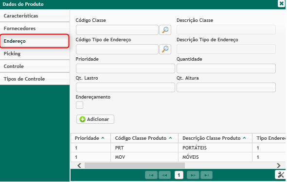 - Código e descrição da Classe: a classe do produto também é de extrema importância, pois indicará para quais endereços aquele determinado produto deverá ser endereçado. E não somente isso, pois pela classe o sistema também buscará as regras de endereçamento, para verificar qual a compatibilidade do endereço x produto;