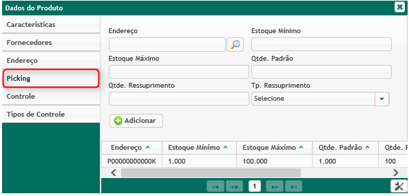 Por endereço de Picking entendemos que são aqueles onde os produtos são separados através da apanha manual. Assim deveremos cadastrar: