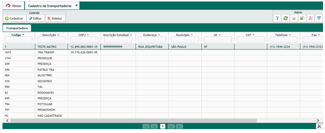 - Opção Transportadora: código e descrição da empresa, código e descrição da transportadora, CNPJ, Inscrição Estadual e situação, podendo ser ativou ou inativo;