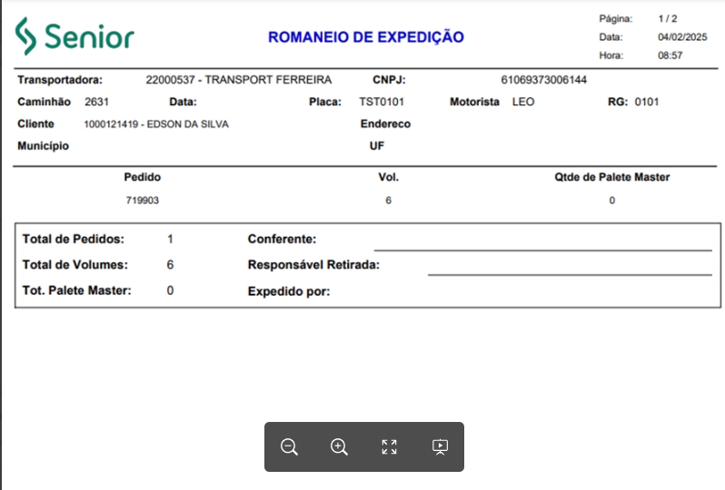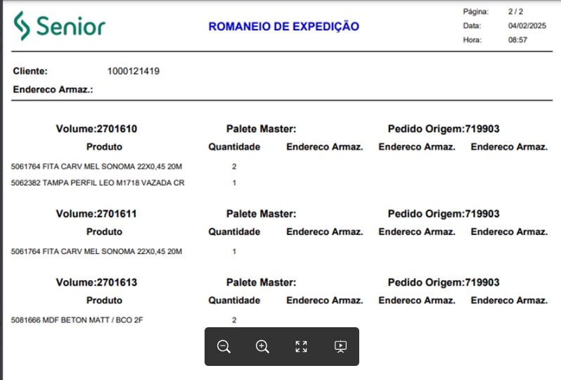 - Página 2: trará os detalhes dos volumes e paletes correspondentes aos pedidos da loja 1004