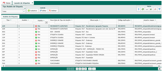 - Padrão: para cada um dos processos, deverá haver um modelo padrão de etiqueta. Por exemplo, para o processo de recebimento, deverá haver um modelo padrão cadastrado, e caso não haja, no momento de gerar as etiquetas o sistema dará mensagem de erro.