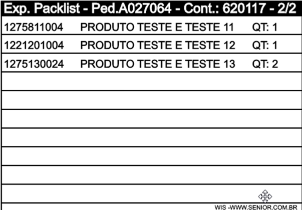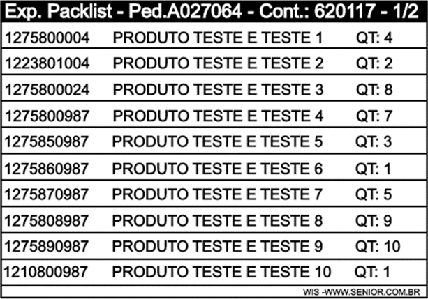 Quando o contêiner principal for fracionado, o sistema imprimirá uma etiqueta complementar contendo informações detalhadas sobre o conteúdo do volume exibindo até 10 linhas com os dados dos itens e suas quantidades; a etiqueta apresentará informações como o Código do Produto, a Descrição do Produto e a Quantidade correspondente a cada item.