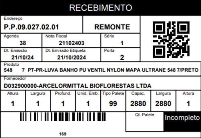 Este modelo de etiqueta de recebimento tem as dimensões de 10 x 7 (cm). Ele incorpora todas as informações presentes no modelo 01, além de adicionar um QRCode e a informação Remonte quando o local de armazenamento já tiver o produto em estoque.