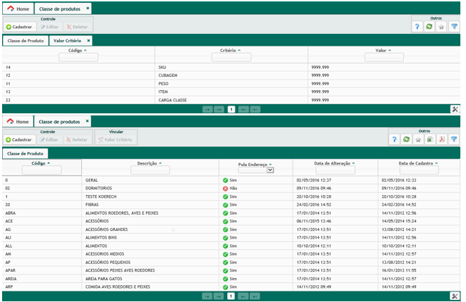 Aplicação permite o Cadastro das Classes de Produtos, além de atribuir o valor de Critérios para a formação dos Grupos de Separação, podendo ser: peso, cubagem, item ou SKU; essa quebra serve para a modalidade de separação por Palete.