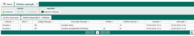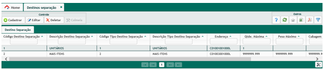 - Código Tipo de Destino Separação: através do filtro, é possível verificar quais são os destinos cadastrados e eleger um deles;