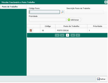 - Para adicionar um novo Posto de Trabalho ao usuário, o usuário deverá selecionar o posto no filtro, a prioridade – caso tenha mais de um posto – e salvar a operação.