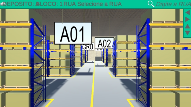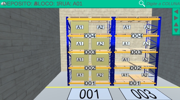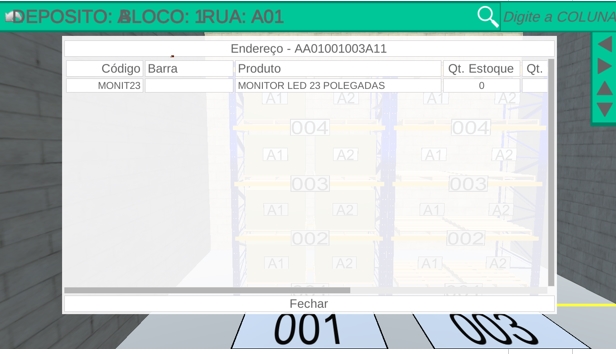 A aplicação exibe a montagem gráfica dos endereços cadastrados na empresa/filial em um ambiente 3D. A navegação nesse ambiente possibilita a movimentação em diversas direções, permitindo a visualização dos produtos em qualquer posição. Ao selecionar um endereço específico, o sistema exibe o saldo atual dos produtos armazenados no local. Essa ferramenta torna mais fácil e rápida a visualização dos estoques e a localização dos produtos no armazém.