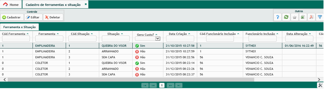 - Cód. Situação: código da situação cadastrada pelo usuário para definir a situação da ferramenta, podendo ser utilizada a mesma situação em outras ferramentas;