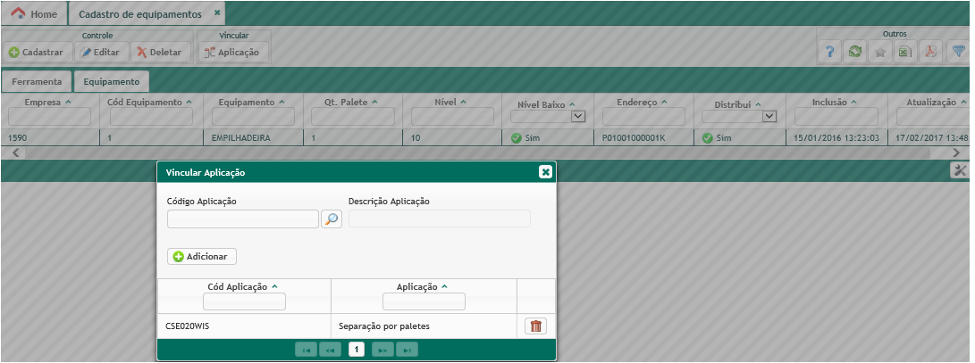 - Vincular aplicação: nessa opção, o usuário deverá vincular quais são as possíveis aplicações permitidas a ferramenta x equipamento. Fazendo isso, o usuário estará restringindo possíveis tarefas que esses equipamentos poderão realizar.