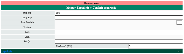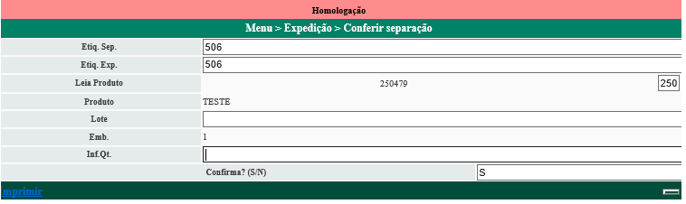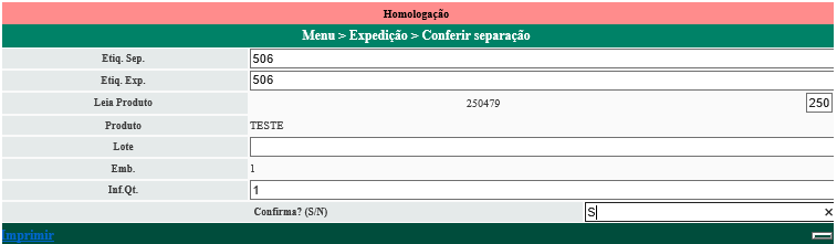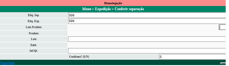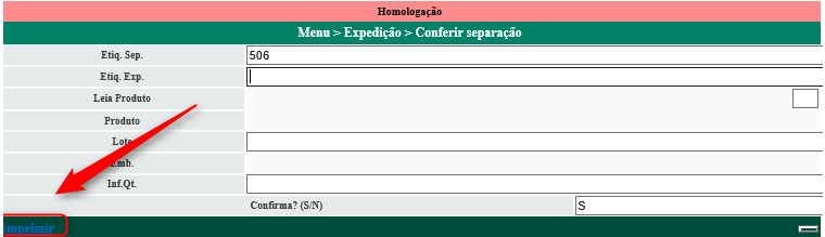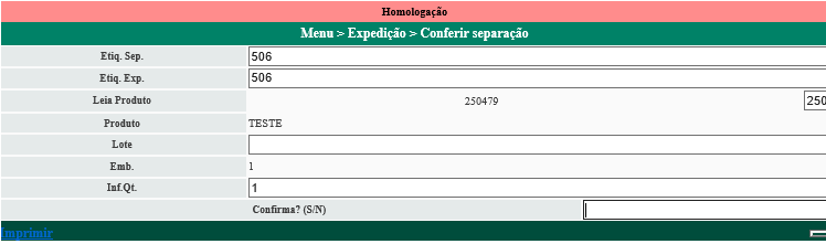 - ET - Etiqueta: Após escolher a impressora, inserir o número da porta de embarque e fornecer as informações do produto, será exibida a mensagem Deseja realizar a conferência? Sim ou Não. Se optar por Não, o sistema confirmará a conferência da separação . Ao verificar no Monitoramento de Expedição, essa separação será marcada como Conferida.
