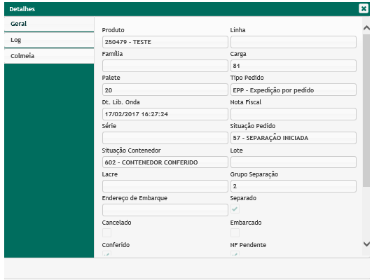 - Log: informações do usuário que efetuou a separação, conferente e embarcador, n∨dm; do caminhão, filial de entrega e demais informações;