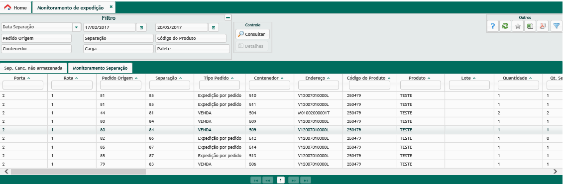 - Monitoramento Separação: essa tela traz informações relacionadas aos processos de separação, conferência, distribuição e expedição de produtos.