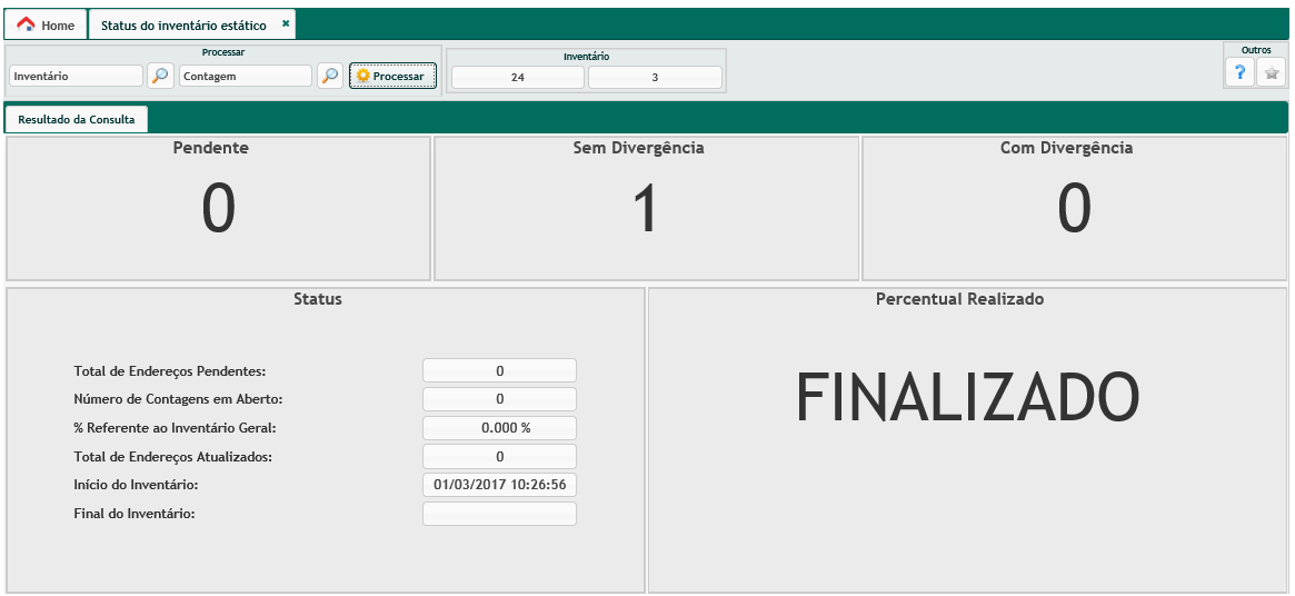 Essa tela muito vale por sua estratégia; durante a execução do Inventário Estático é possível visualizar o status das contagens.