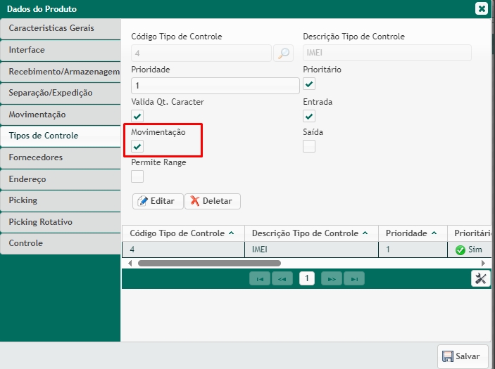 - Vincule o tipo de controle criado anteriormente e especifique o momento em que o controle será realizado, no caso do processo de Separação por Palete ative o parâmetro Movimentação na tela de Cadastro de produto > Opção Tipo de Controle
