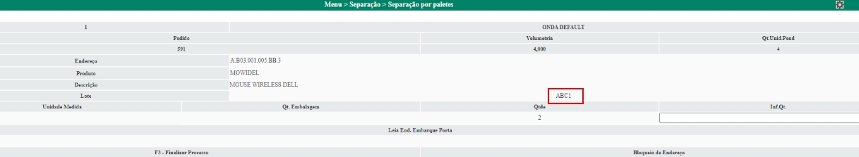 Para realizar a leitura manual do palete, é necessário que os parâmetros Lote Automático com Multi-Lote e Leitura Automática de Lote estejam desabilitados no sistema.