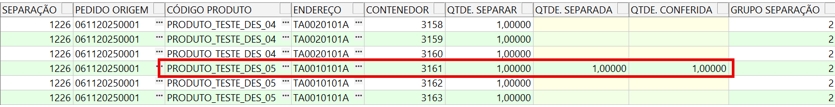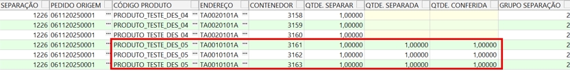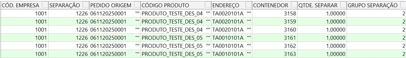 Neste cenário, a separação 1226 contém dois produtos distintos: PRODUTO_TESTE_DES_04 e PRODUTO_TESTE_DES_05. Durante a liberação da separação, o sistema gerou seis contenedores (3158 a 3163), todos vinculados ao grupo de separação 2, conforme demonstrado na imagem anterior.