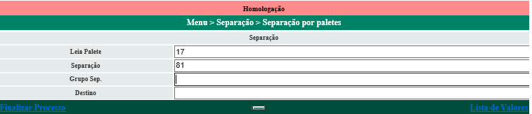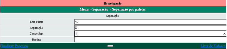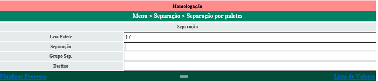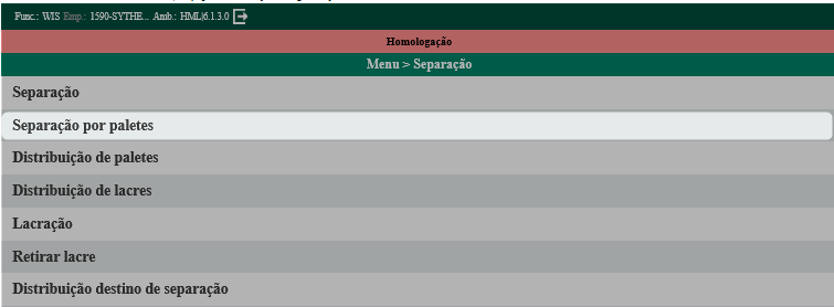 A aplicação foi desenvolvida para executar o processo de separação por meio da etiqueta do palete. Esse processo segue a divisão do grupo de separação para ser realizado. O coletor designado para essa tarefa será utilizado na separação por palete. Para iniciar, basta acessar a tela ou a Convocação Ativa, realizar a leitura do palete e prosseguir com a separação indicada.