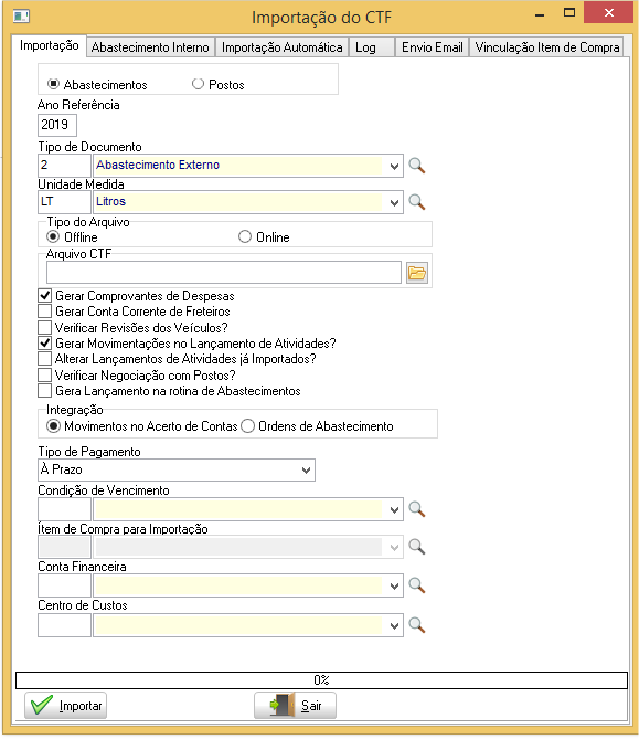 A importação é realizada automaticamente através do módulo RBT que fica constantemente consultando o webservice do portal CTF verificando se há novos registros para importação. Caso houver, a importação dos abastecimentos é realizada conforme os dados informados na guia Importação em GFV > Utilitários > Custo da Frota > Importação do CTF
