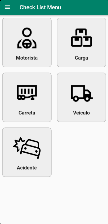 Após realizar o login o usuário será direcionado para a tela inicial e deve selecionar o check-list que irá realizar dentre as opções: Motorista, Carga, Carreta, Veículo e Acidente.