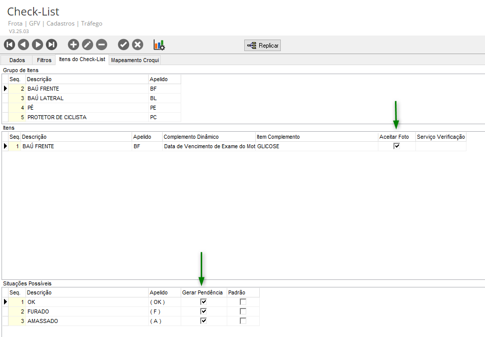 Da mesma forma que os itens de cada check-list são cadastrados no módulo GFV em Cadastros > Cadastros Gerais > Check-List – Guia, “Itens do Check-List :
