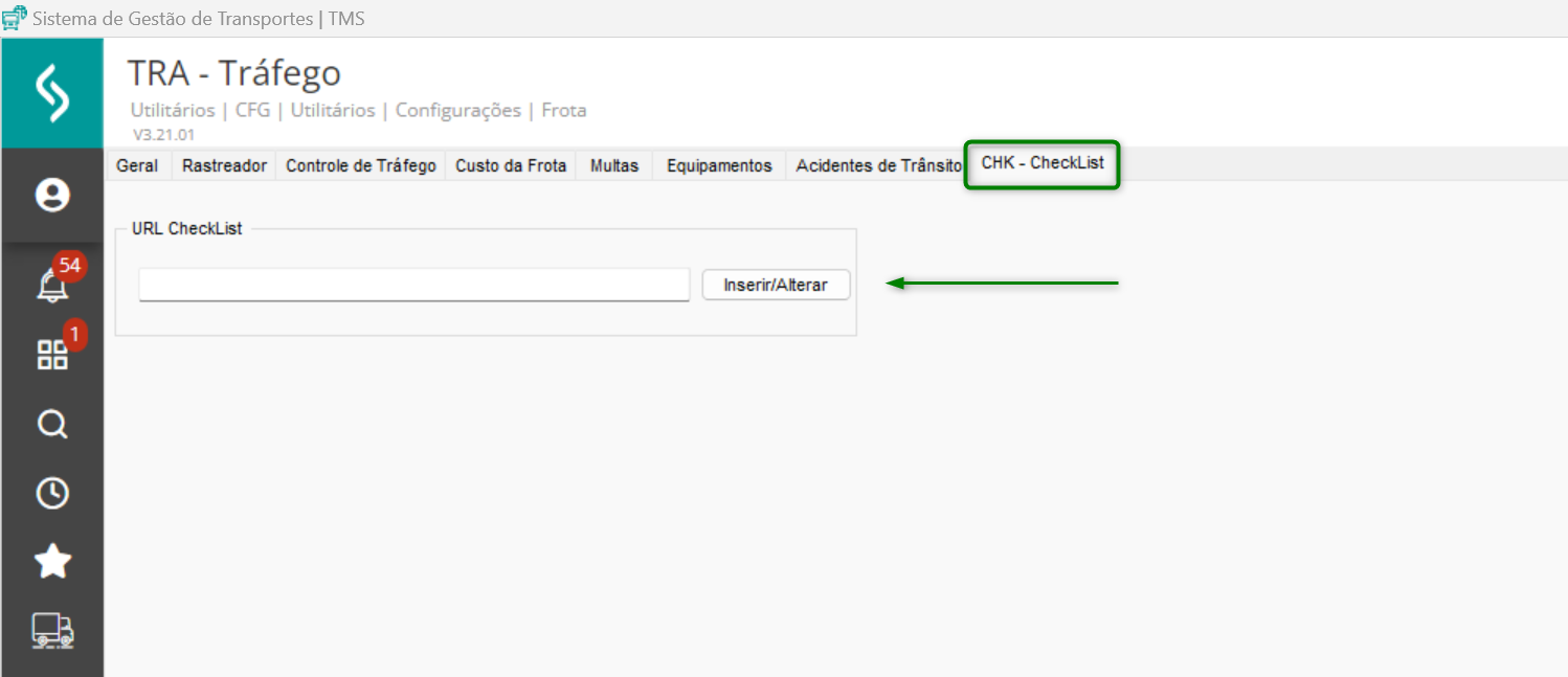No módulo CFG em Utilitários > Configurações > Frota > TRA - Tráfego, incluímos a guia CHK - CheckList, que apresenta o campo Url CheckList, devendo ser preenchido com a URL onde o serviço do App TMS Check-List se encontra.