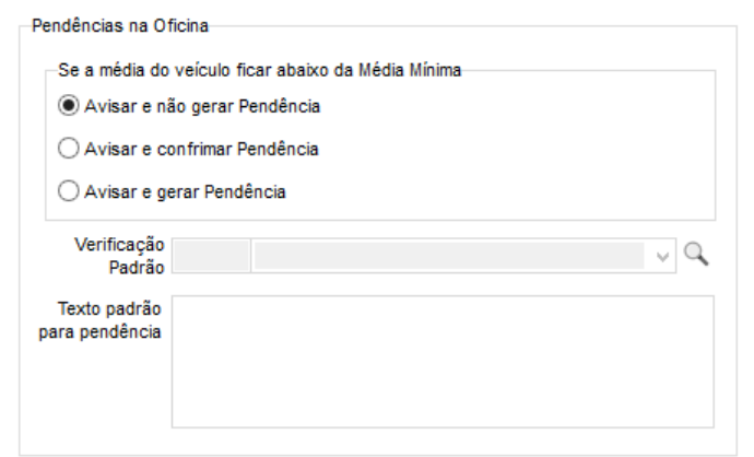 No quadro Pendências na Oficina, será definido como será o alerta e abertura de pendência quando o veículo ficar abaixo da média mínima estipulada.