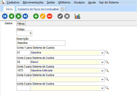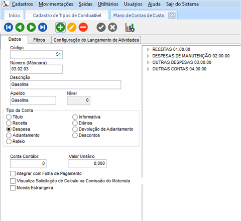 No módulo GFV em Cadastros > Abastecimentos > Tipo de Combustível, pode ser configurada até 5 contas para o tipo de combustível.
