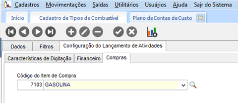 No menu Cadastros > Cadastros Gerais > Planos de Contas da Frota, na guia Configuração de Lançamento de Atividades > Compras, estará o item de compra configurado para a conta, onde, este produto deverá ser o mesmo código configurado no cadastro do tanque da bomba.
