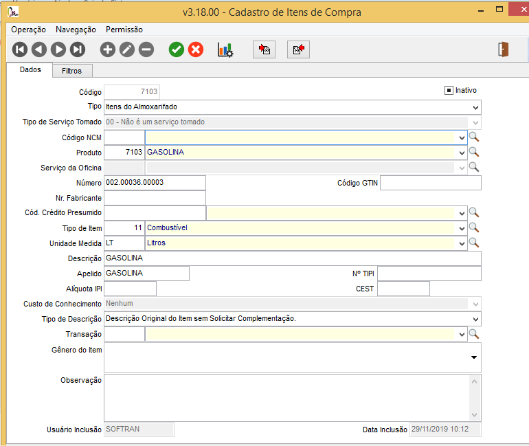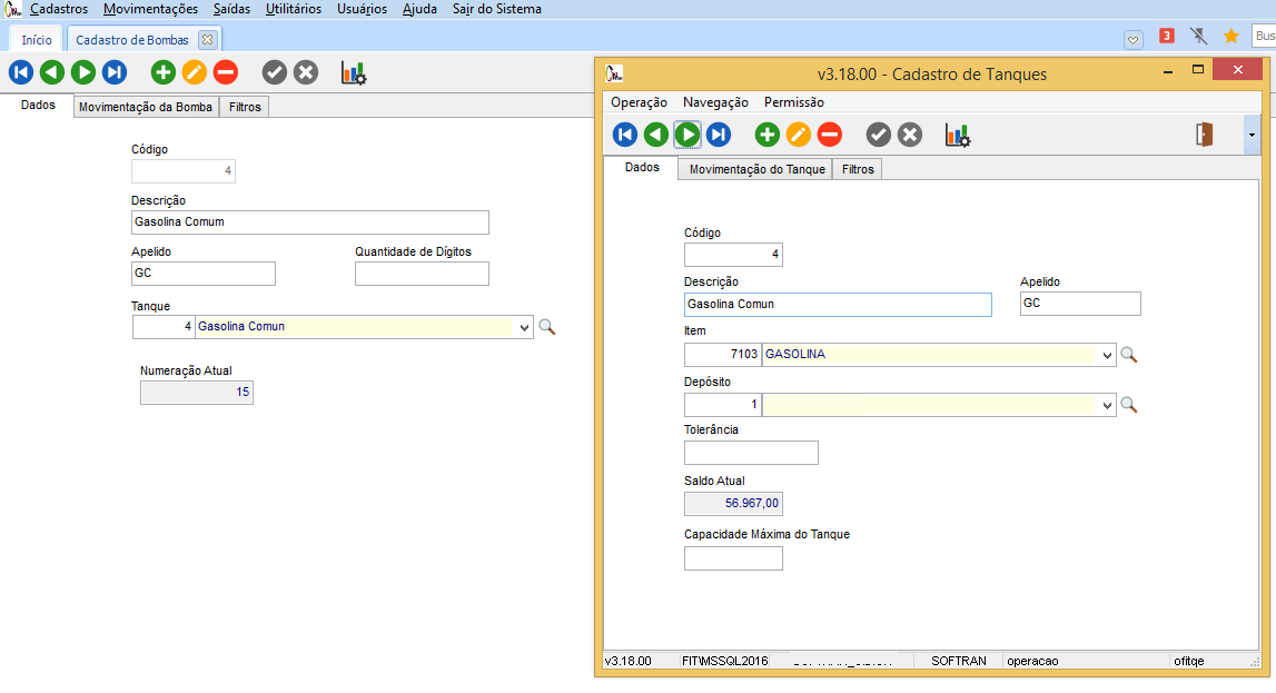 As contas configuradas para o tipo de combustível cadastrado para o veículo, o produto associado ao item de compra configurado para as contas, deverá ser o mesmo produto cadastrado no tanque da bomba que está ocorrendo o abastecimento.