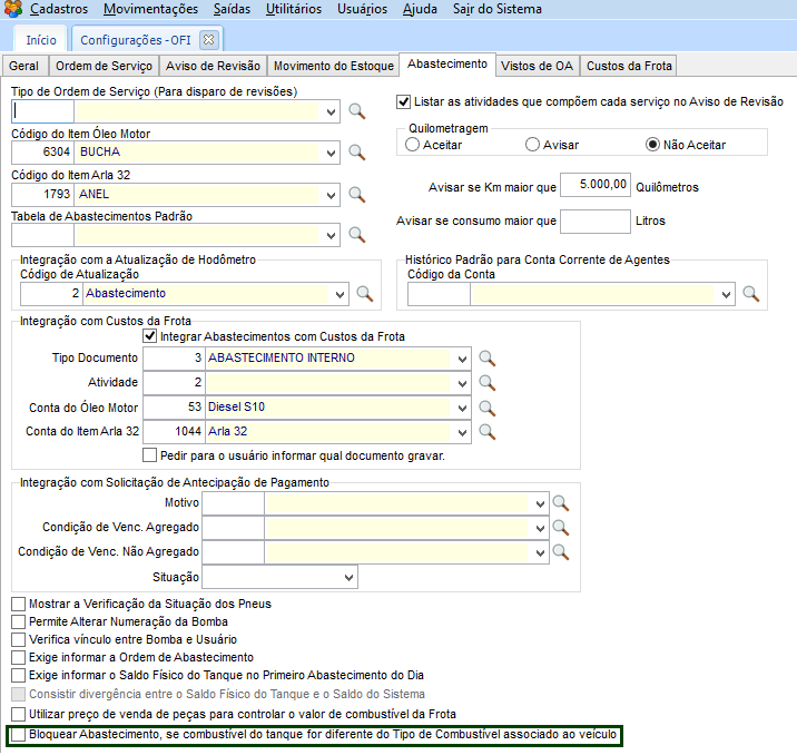 Em CFG > Utilitários > Configurações > Frota > OFI-Oficina > Abastecimento marque a opção Bloquear Abastecimento, se combustível do tanque for diferente do Tipo de Combustível associado ao veículo para que o bloqueio no abastecimento seja realizado, caso não deseje o bloqueio deixe a opção desmarcada.