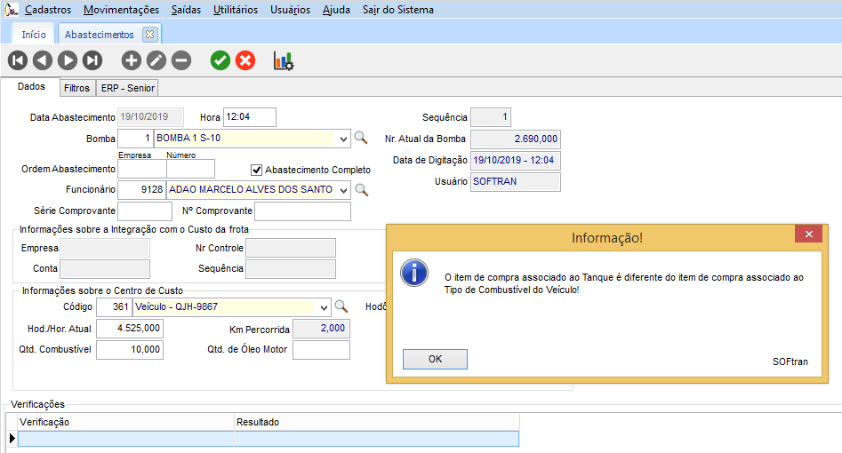 A rotina realiza o bloqueio do abastecimento do veículo, para não abastecer com combustível diferente do cadastrado para este veículo.