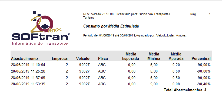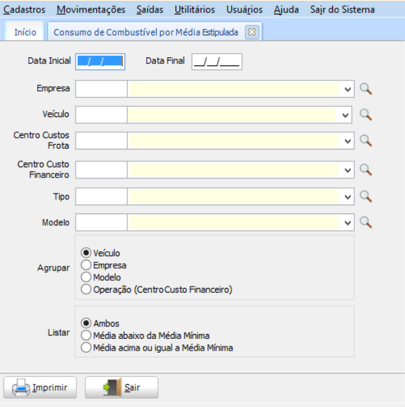 Em GFV > Saídas > Consumo de combustível por > Média Estipulada, é possível consultar e analisar o consumo e média do veículo.