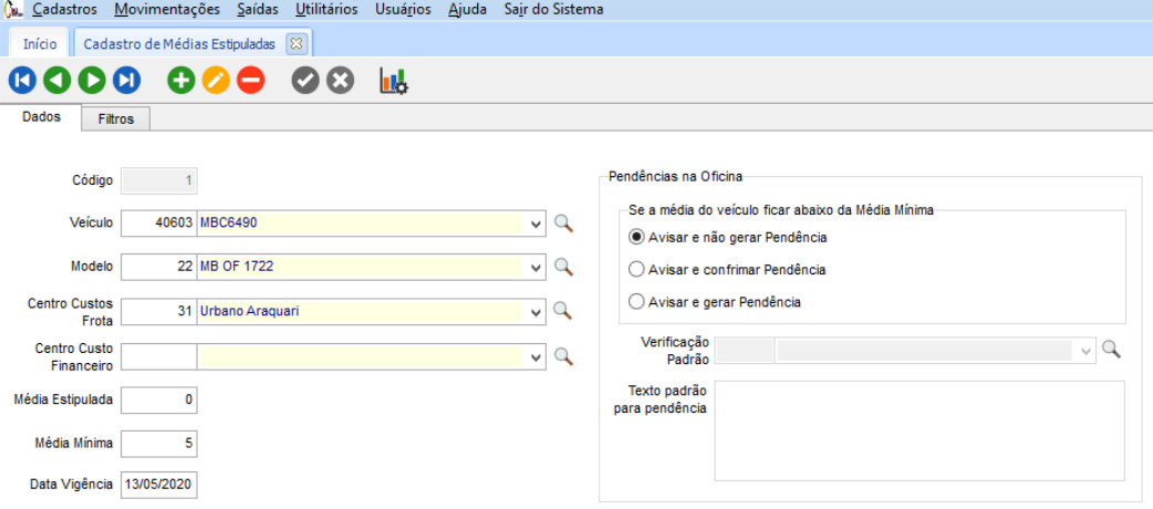 Se o modelo do veículo já estiver com a média de combustível cadastrada em: Cadastros > Veículos > Características de Veículos > Modelos de Veículos, no campo Média Estipulada será apresentado o valor, mas sendo possível alterar se necessário.