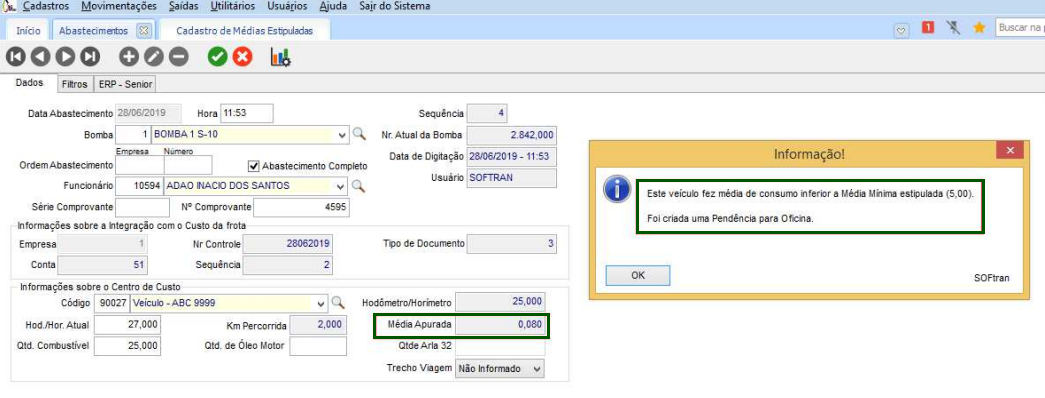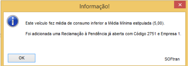 - Avisar e não gerar Pendência: ao cadastrar o abastecimento somente será avisado que o veículo ficou abaixo da média;