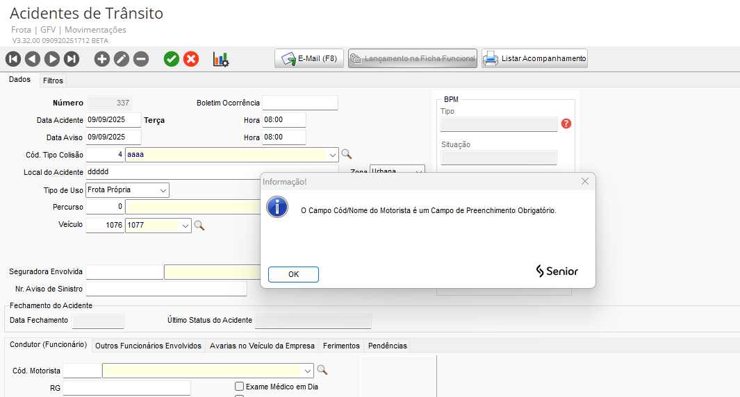 - Ao cadastrar um novo registro, alguns campos que não estão na listagem de permissões se tornarão obrigatórios. Esses campos são essenciais para garantir que o cadastro esteja completo, e incluem: Veículo, Data Acidente, Hora Acidente, Cód. Tipo Colisão e Local Acidente.