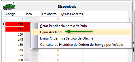 - Nos grupos de veículos Disponíveis, Planejados, Manutenções Vencidas ou Indisponíveis, localize um veículo destacado em vermelho (o que indica que possui pendência do tipo acidente, mas não tem acidente aberto) e clique nele com o botão direito do mouse;