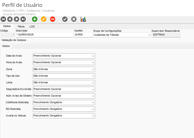 Na tela de permissões do Perfil de Usuário, incluímos um novo grupo de configurações chamado Acidentes de Trânsito. Neste grupo é exibida a guia principal Validação de Campos com uma subguia Dados. Para cada campo constam as opções: Preenchimento Opcional, Preenchimento Obrigatório e Não Informar. De acordo como o campo é configurado, será obrigatório ou não o preenchimento dele na tela de Acidentes de Trânsito.