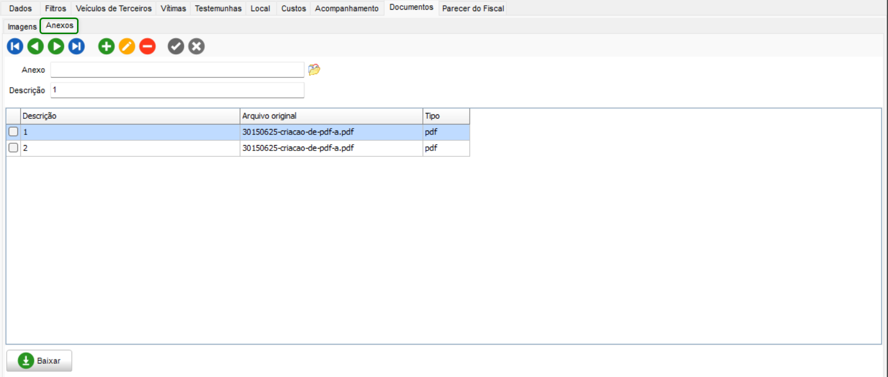 Na sub-guia Anexos, será possível enviar documentos de diversos formatos (arquivos de texto, planilhas, imagens, PDF e HTML). A principal diferença entre as guias Imagens e Anexos é que, ao contrário das imagens, os documentos anexados não são exibidos no lado direito da tela ao serem selecionados: