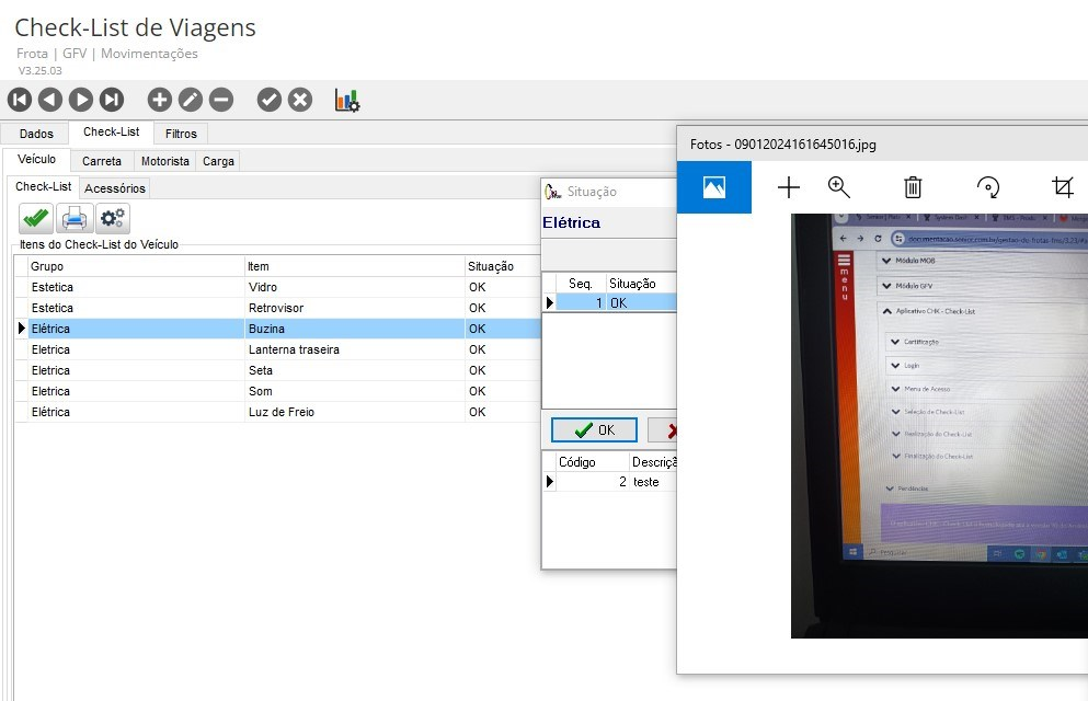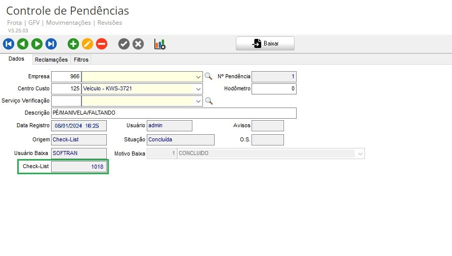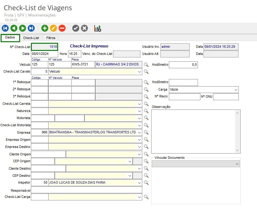 No módulo GFV, o check-list número 1018, recém cadastrado, poderá ser visualizado na rotina Movimentações > Revisões > Check-List de Viagens guia Dados.