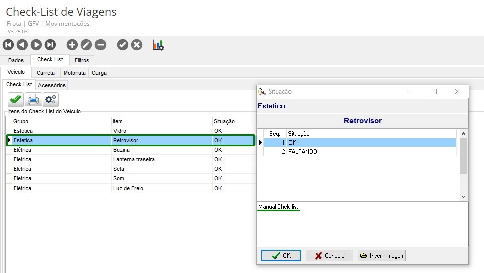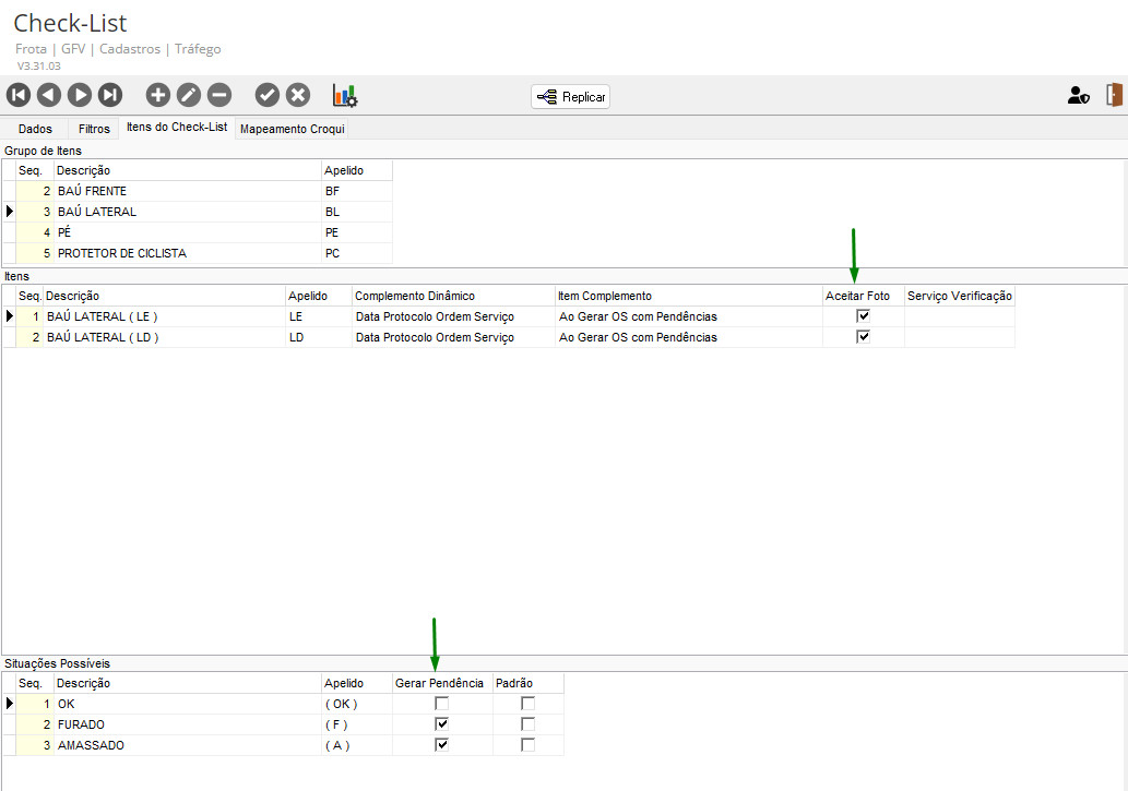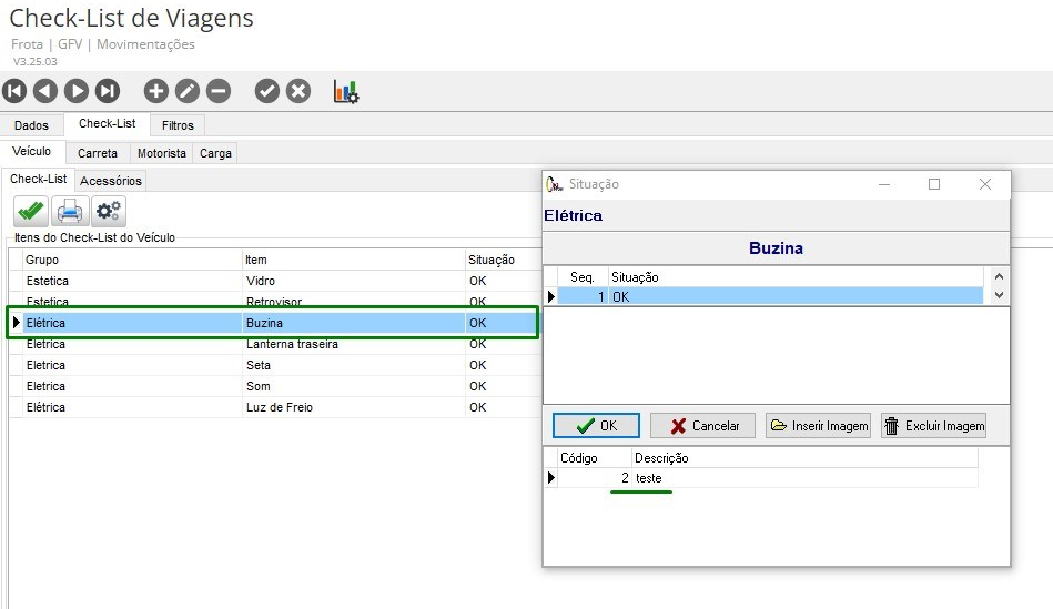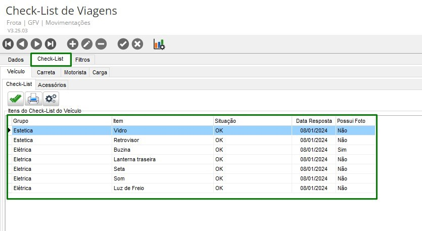 Da mesma forma que os itens de cada check-list são cadastrados no módulo GFV em Cadastros > Tráfego > Check-List – guia Itens do Check-List .